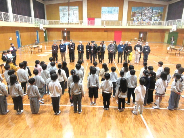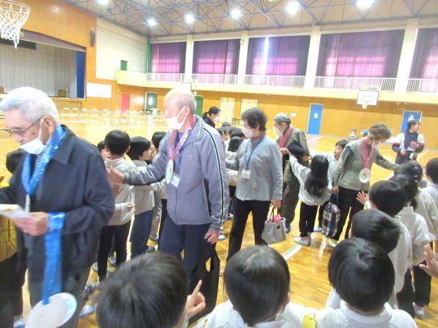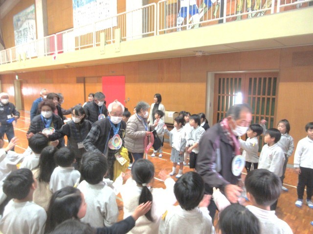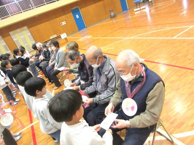 楽しいひとときが終わると、1年生が東苫田老人クラブの皆様にプレゼントやお手紙を渡し、最後にみんなでお見送りをしました。老人クラブの皆様、今回も大変お世話になりました。来週の『お飾りづくり』もどうぞよろしくお願いいたします。