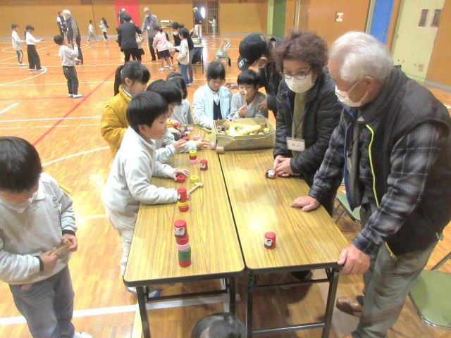上手にできて声をあげて喜んだり、うまくできずに泣きべそになったりと、それぞれのコーナーで一生懸命あそぶ子どもたちの姿に老人クラブの方々も目を細められていました。