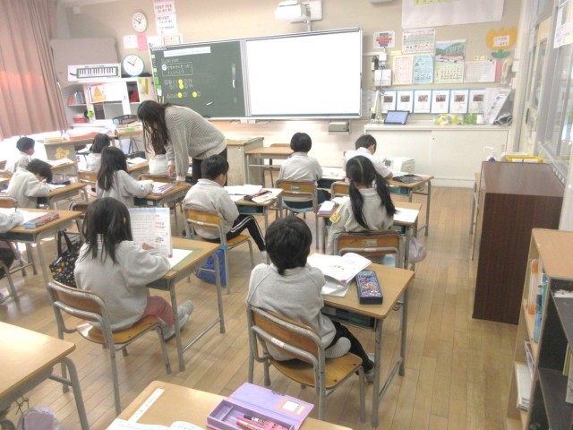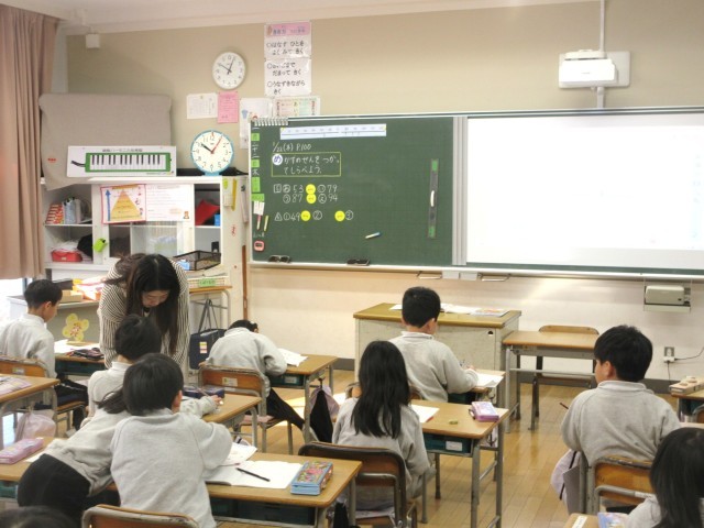 1年生は算数で「68より 4 おおきいかず」というような数の概念について学んでいます。この日は数直線を利用しながら、子どもたちが数のイメージを拡げられるよう、机間指導を行っていました。