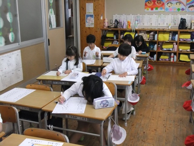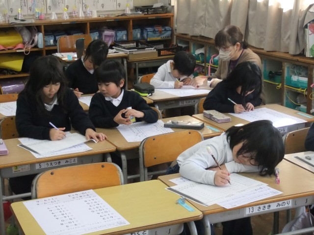 1-2の算数の様子です。足し算や引き算を「速く!」「正確に!」解けるよう、一生懸命取り組んでいます。