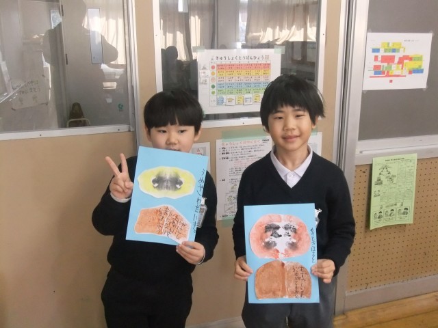 1年生が3学期の目標を絵馬に書いていました。また、図工で作っただるまも貼り、個性あふれる素敵な作品ができあがっていました。中には○○な2年生になりたいという目標もあり、次のステップへ気持ちが向かっているなと感心しました。目標を達成できるように、毎日を大切に過ごしてほしいですね!