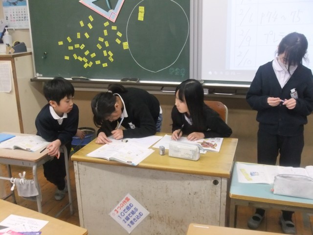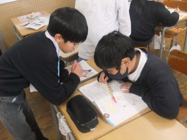 算数では、課題に向かって自分が一番がんばれるやり方を自己決定し、取り組んでいました。一人で黙々とがんばる人、友だちと相談しながらがんばる人、様々ながんばる姿を見ることができました。