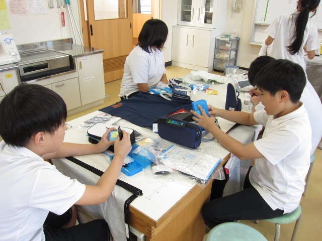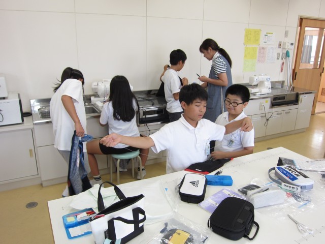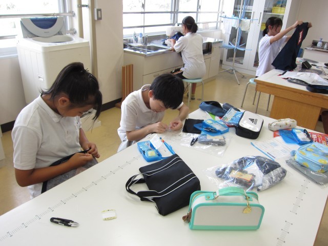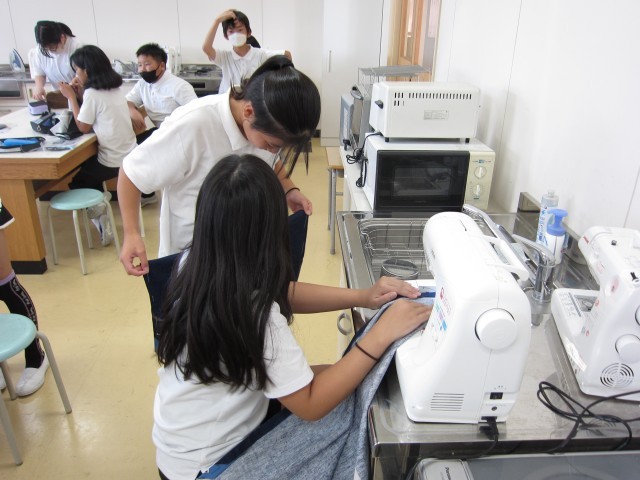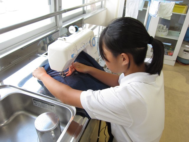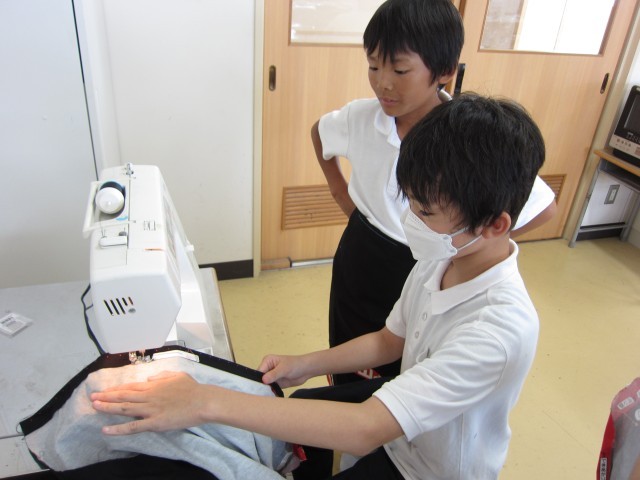 6年生は、家庭科の時間に家庭科室でエプロン作りをおこなっています。
