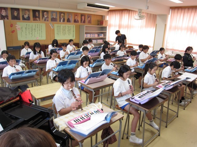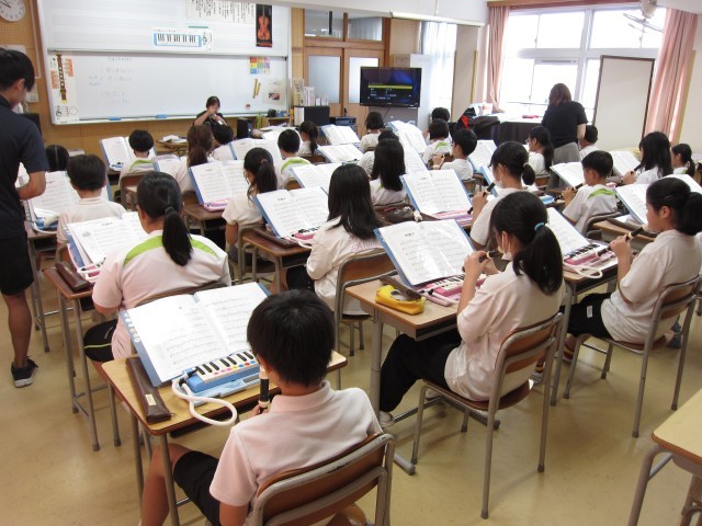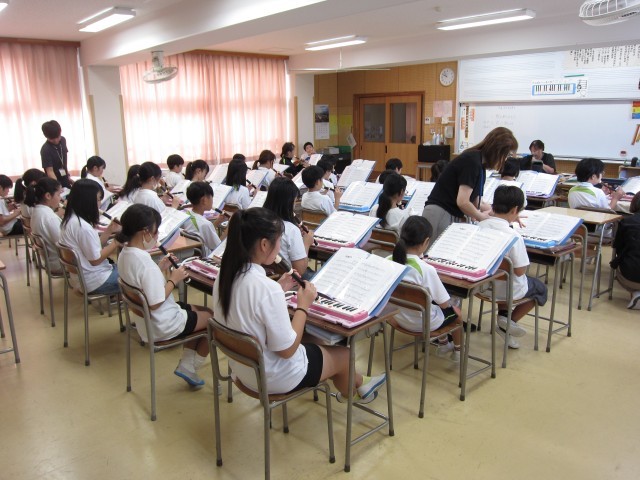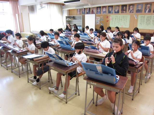 5年生は、音楽室で合奏「夜に駆ける」の練習をスタートしました。