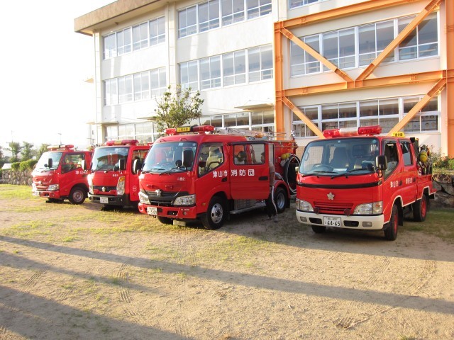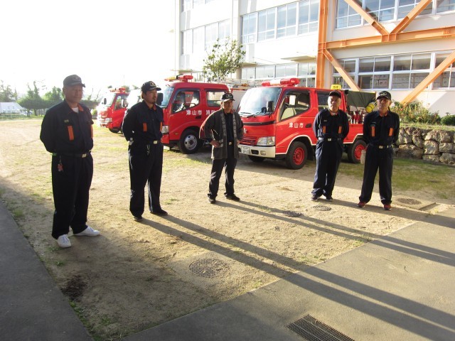 最初に、津山市消防団田邑分団・二宮分団の方々のサポートをいただきながら、消火訓練をおこないました。