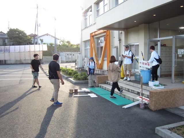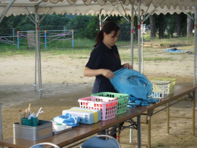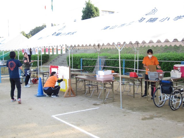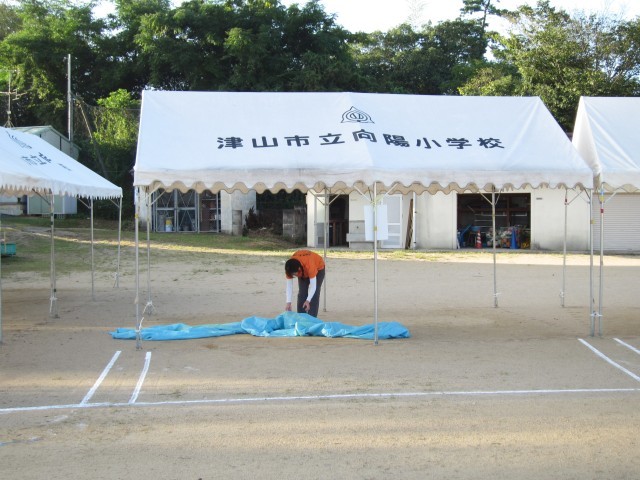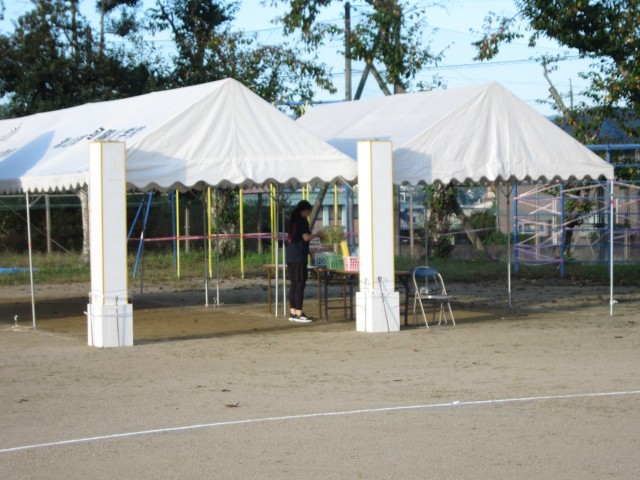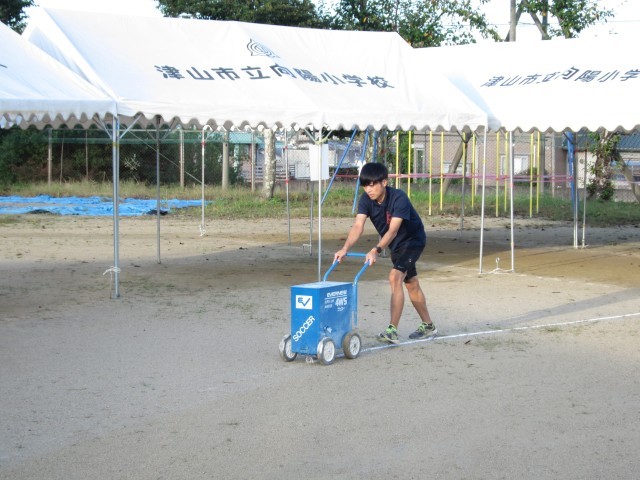 係のセッティング、机・イス運び、白線引き、シート敷き、ビブス準備、PTAは駐車場準備等、早朝より学校が動き始めました。