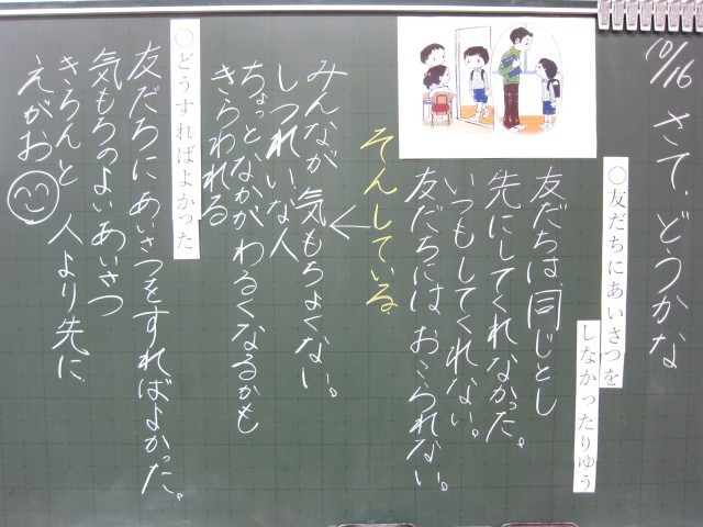 単元は「さて、どうかな」(あいさつや一言があると)でした。