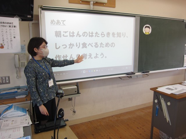 今回は「朝ごはんの働きを知り、しっかり食べることの重要性について考えよう。」のめあてでした。