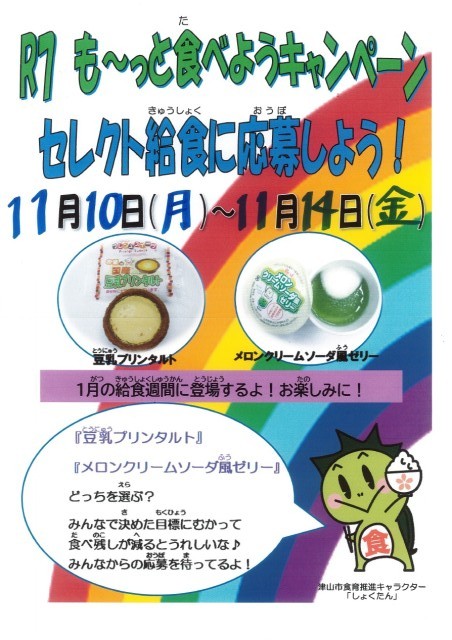戸島学校食育センターより、「も~っと食べようキャンペーンでセレクト給食に応募しよう」のご案内が学校に届きました。