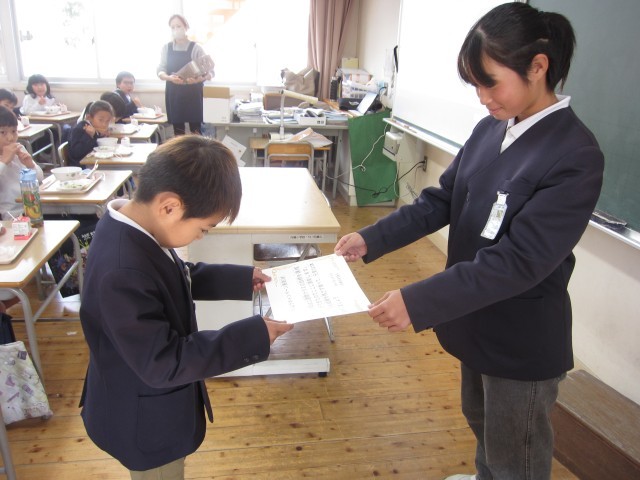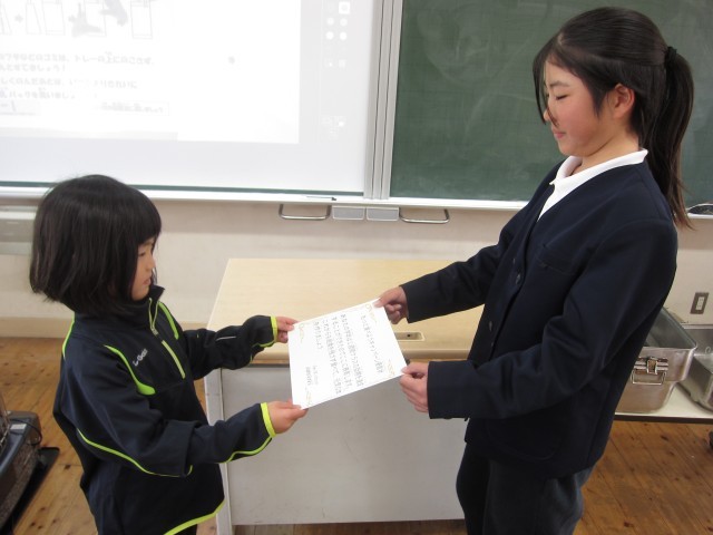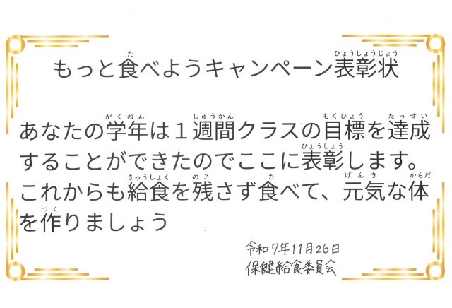 をクラスの目標にして、クラス全員の取り組みが目標達成できたので、保健給食委員会から表彰状が届けられました。