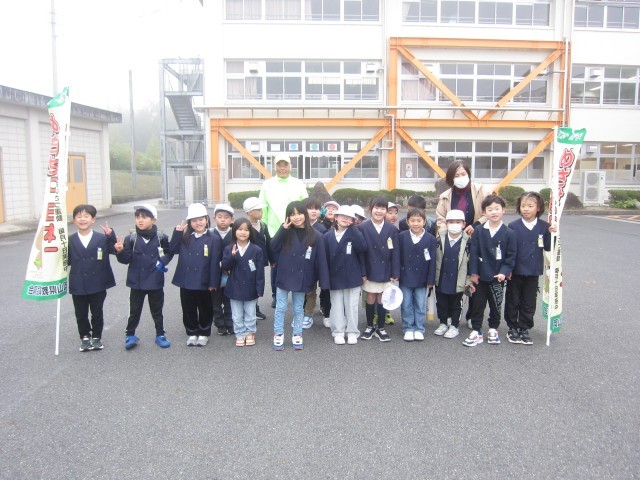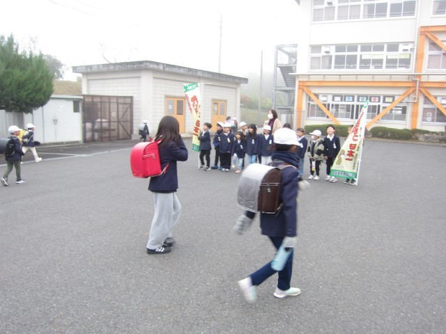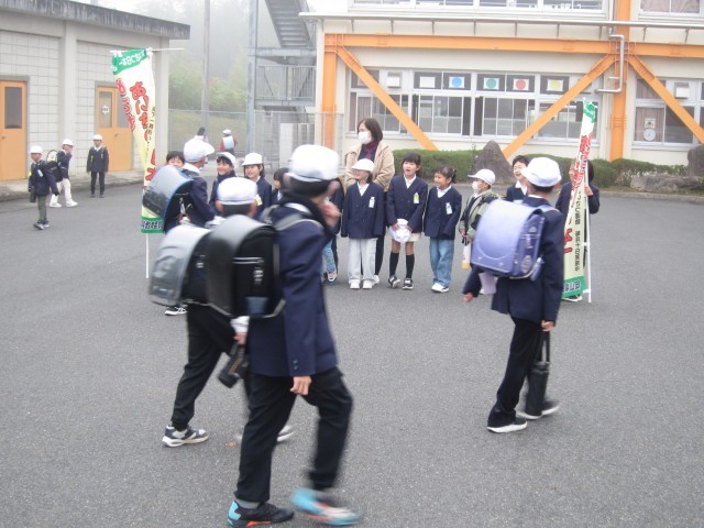 本日は霧の中ではありましたが、1年生の子ども達が「あいさつ運動」に参加してくれました。