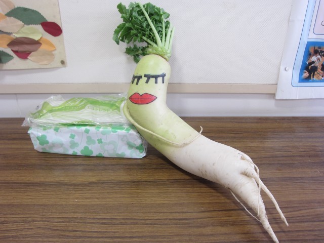 向陽小学校の教職員が、自宅で栽培している大根の中から、オモシロい大根が採取されたので学校に持ってきてくれました。