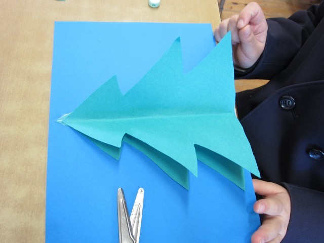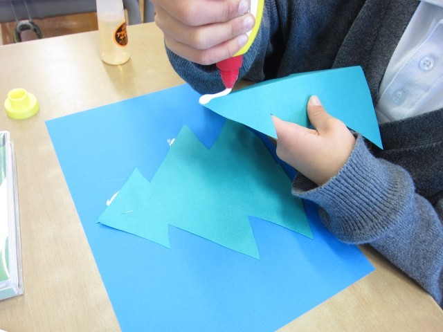 上手にクリスマスツリーを切り、台紙に貼っていました。