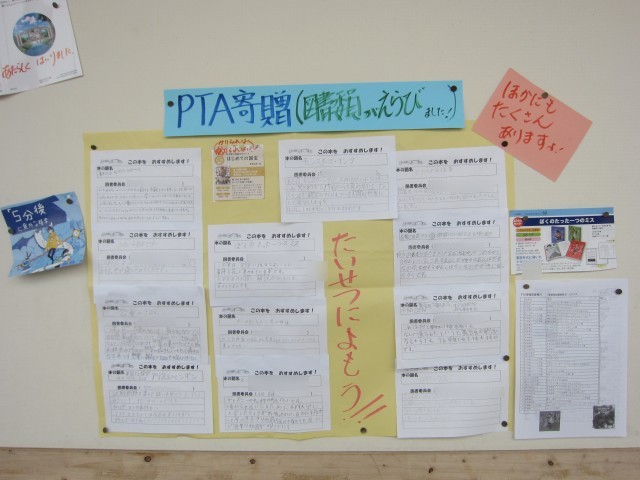 PTAから寄贈していただいた本の紹介を、図書室前の掲示板に図書委員会の子ども達が紹介をしてくれてます。