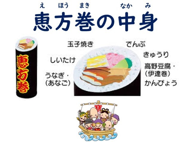 恵方巻は7種類の具材を巻くようですが、7種類=七福神をイメージして作られているようです。
