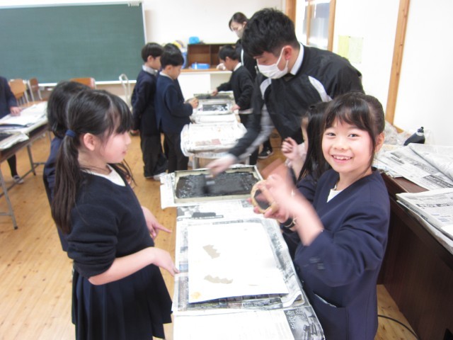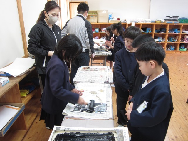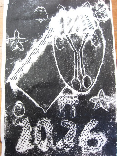 授業の様子(2年生) 公開日 2026/02/06 更新日 2026/02/06 お知らせ 2年生も紙版画の印刷の活動をしました。小学校では2回目なので、慣れた手つきで作業を進めていました。今年の干支である「午(うま)」をテーマに作品を仕上げました。どの子どもも、作品が仕上がると表情が緩み、嬉しそうな笑みで作品を飾っていました! +7