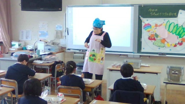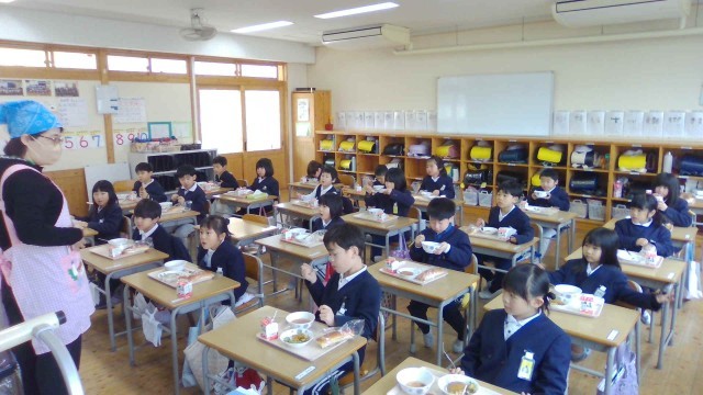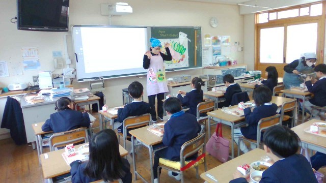 津山市戸島学校食育センターの先生が、1年生の給食指導に来てくださいました。
