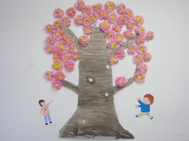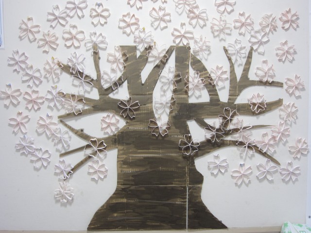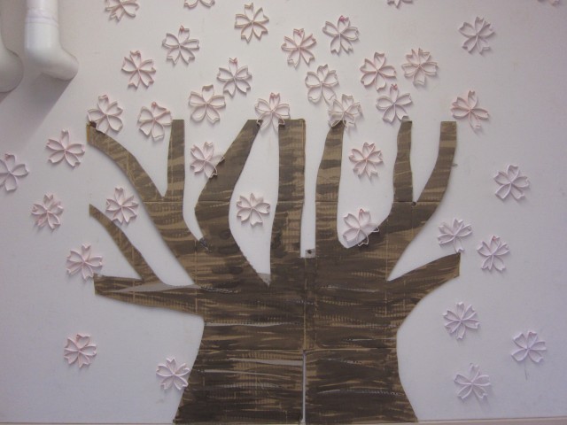 廊下の掲示板では、卒業のお祝いに向けた桜🌸の木が掲示されています。