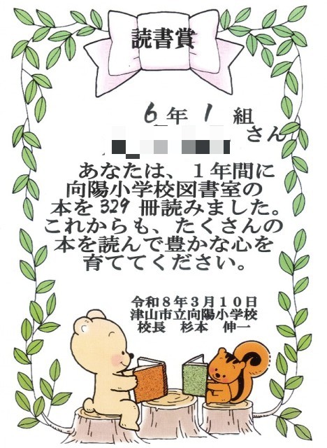 1年間に329冊の本を借りて読んだことに対しての表彰状です。