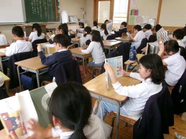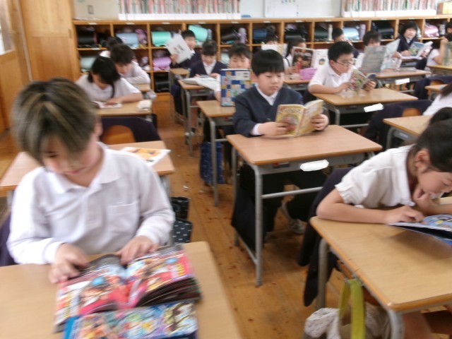 月・水・金曜日の午後1時10分~20分までは、全校読書タイムです。昼休みが終わって教室に戻ると、子どもたちは、すぐに読書を始めます。事前に図書室で借りた本や津山市立図書館から届いた配本を読みます。