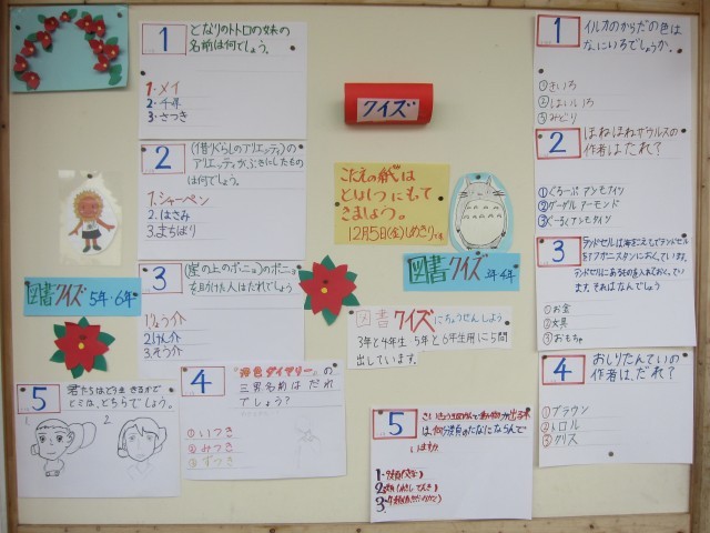 今週は、図書委員かによるクイズが、図書室前の掲示板に掲示されています。給食時間の...