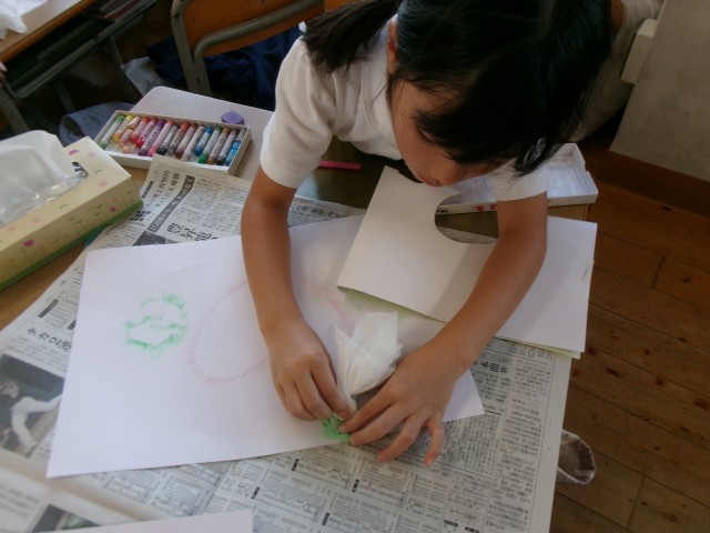 指先を使って夢中でこする姿はとても真剣で、完成した作品を見て「きれいにできた!」と嬉しそうに声を上げる子もいました。