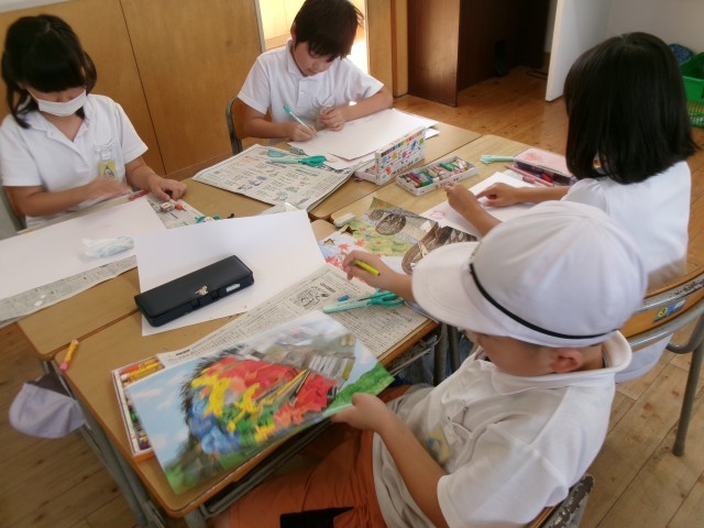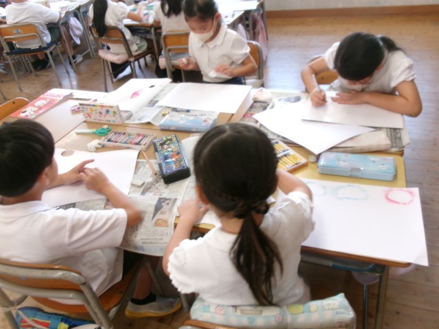 子どもたちは色の重なりや濃淡の変化を楽しみながら、自分だけの表現を工夫していました。