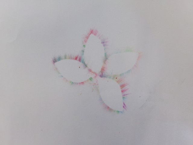 型紙を画用紙にあてて、指で色をこすりながら少しずつ広げていくと、ふんわりとしたやさしい模様が浮かび上がります。