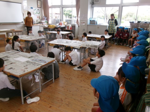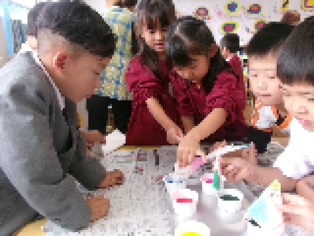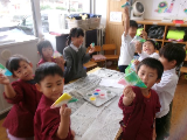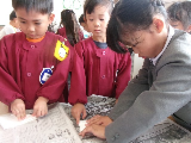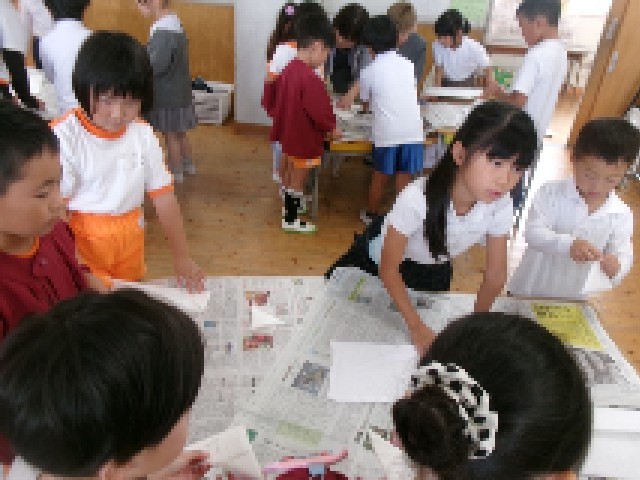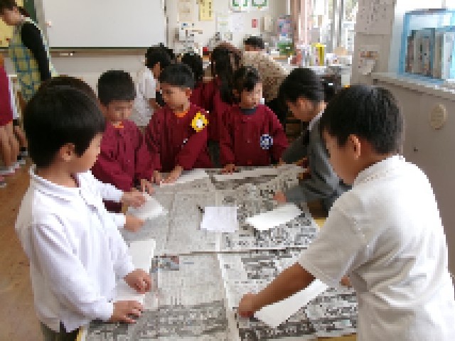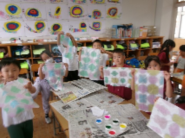 年長さんとグループになり、やさしく声をかけながら折り方や染め方を教える1年生の姿に、この一年間の成長を感じました。