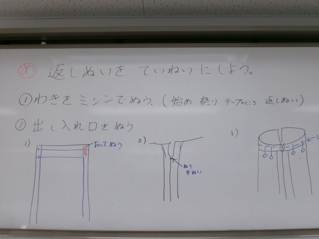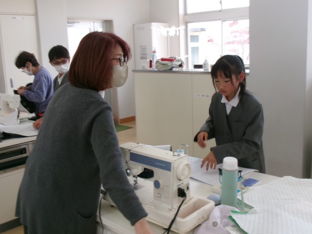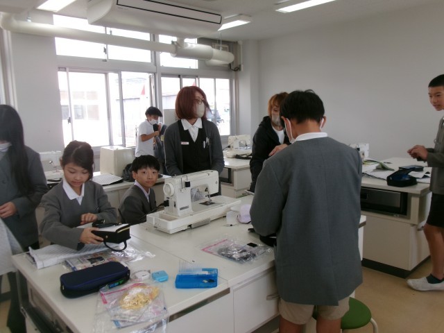 5年生の家庭科では、ナップサック作りで、返し縫いの練習やミシンを使った作業に取り組んでいます。