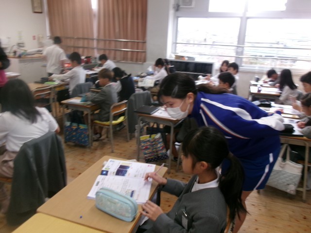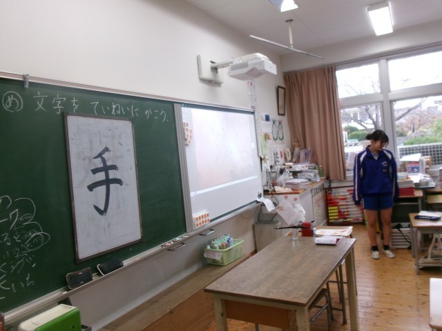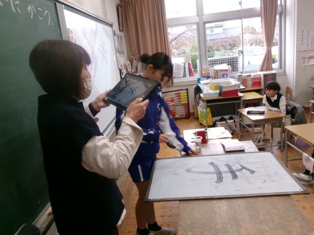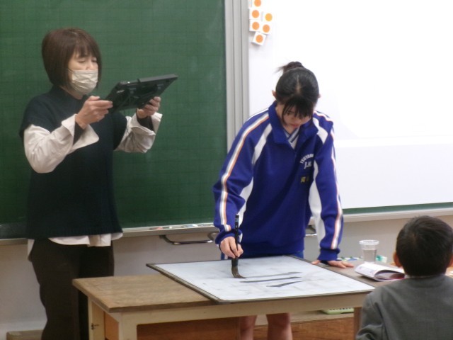 1年生の教室では、特技である「習字」を披露する場面もありました。