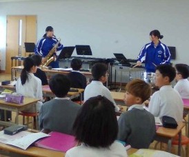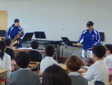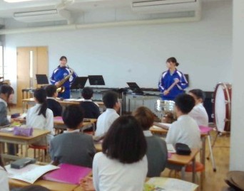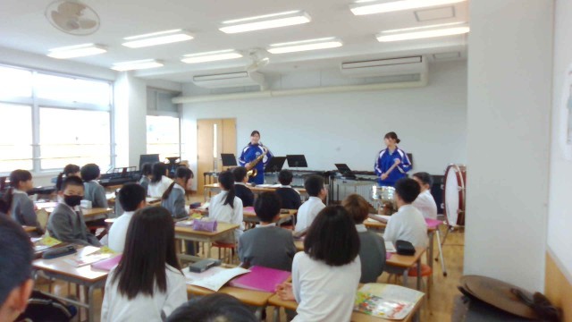 サックスの澄んだ音色と、小太鼓のリズムのきいた力強い響きが教室いっぱいに広がり、子どもたちは目を輝かせながら聴き入っていました。