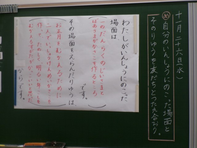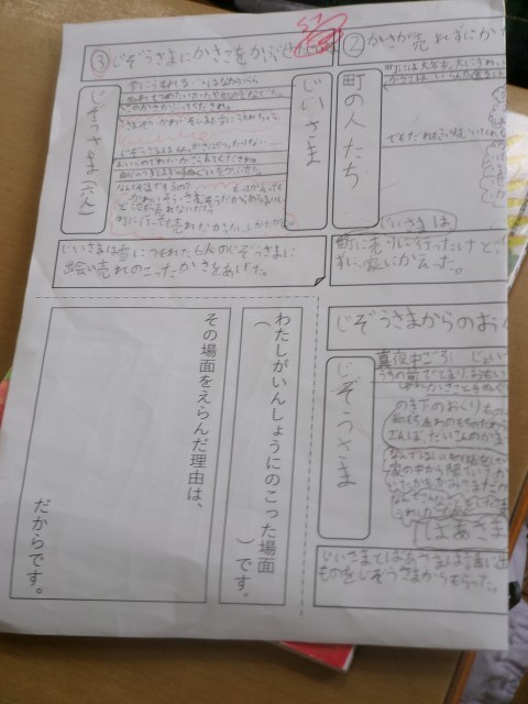 国語科「かさこじぞう」の学習で、これまで取り組んできた“図読”を活用し、物語の中から自分が印象に残った場面を選び、その場面と選んだ理由を文章にまとめる活動を行いました。