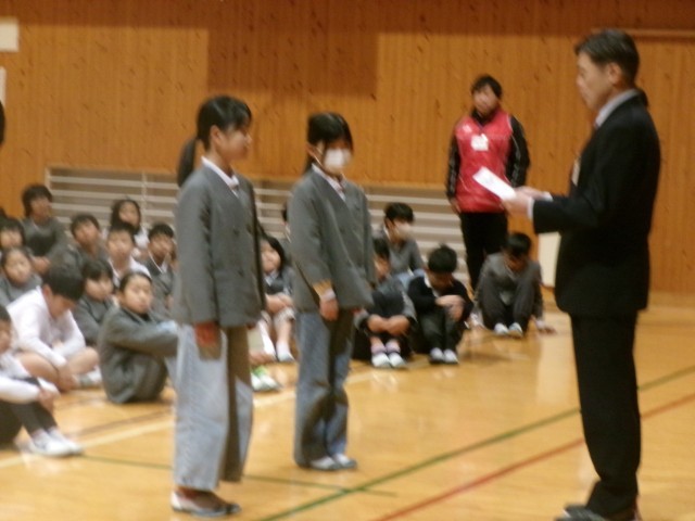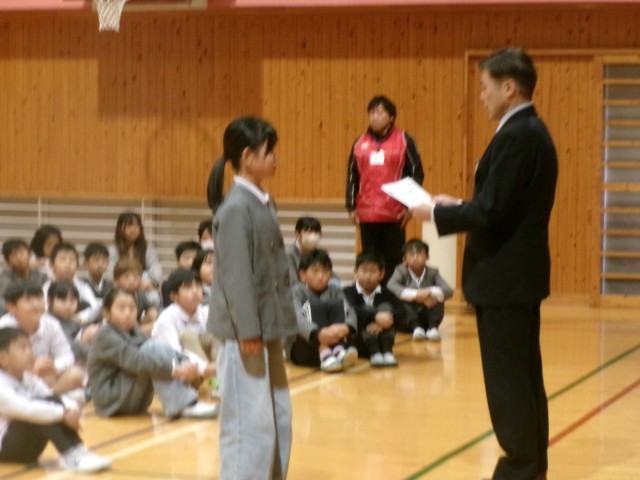 続いて、「お手本ノート」の表彰が行われ、日頃の学習に真剣に取り組んでいる児童が紹介されました。