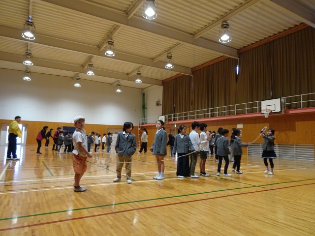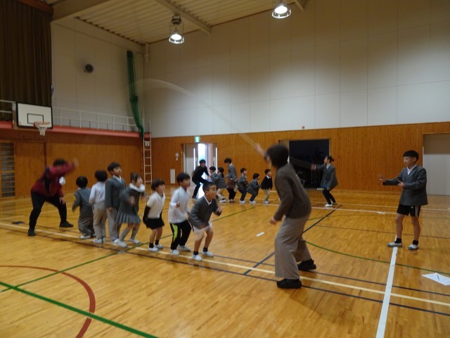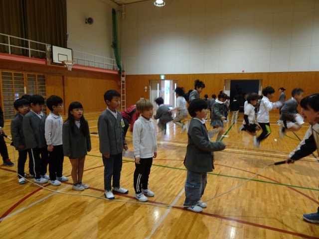低学年の子どもたちは、縄の回るリズムに合わせて声をかけ合いながら、力を合わせて跳び続けました。