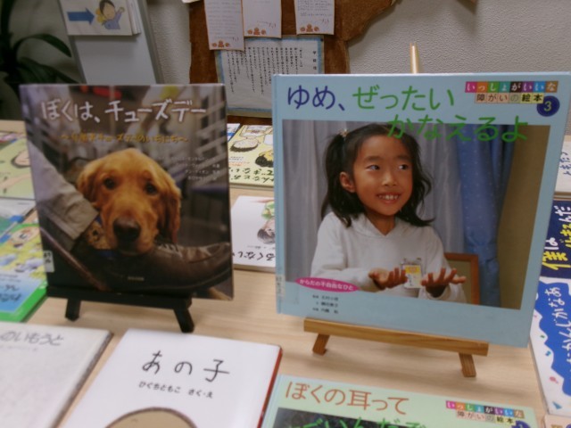 展示では、障害のある人やLGBTQについて知ることができる本、戦争や貧困の中で暮らす子どもたちの姿を伝える本など、図書室にあるさまざまな資料が紹介されています。