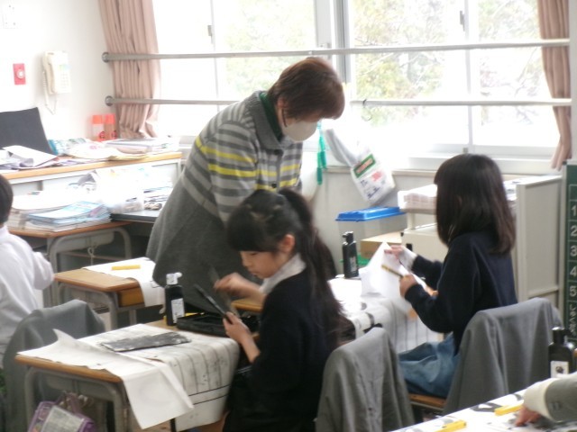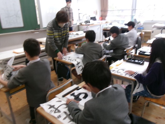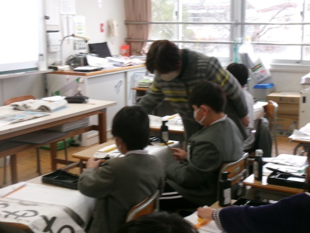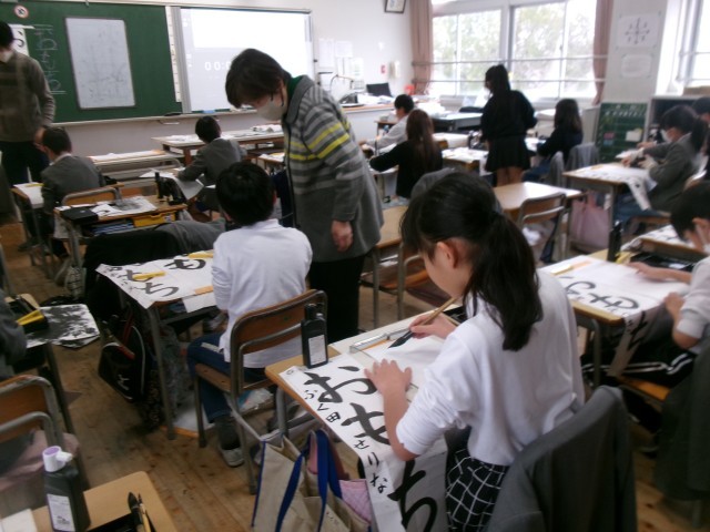 3年生は2学期最終の書写の時間、延札先生をお招きして書初めの指導をしていただきました。