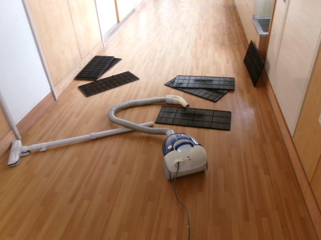 日頃から気になっていながら、なかなか手を付けられずにいたエアコンのフィルター掃除をはじめ、長年の懸案だった体育館の網戸清掃、体育倉庫の整理、図書室の本の整備、家庭科室の調理器具や理科室の薬品の点検・整理など、職員総動員で校内環境を整えました。