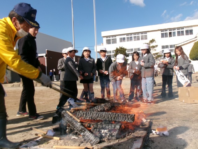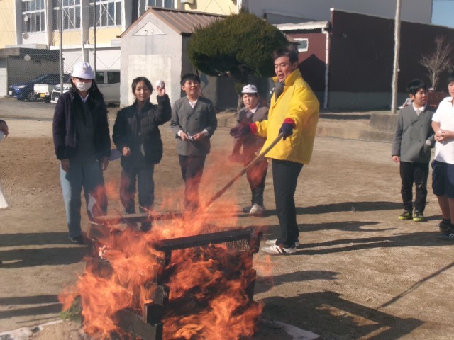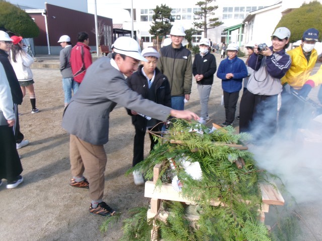 当日は、書き初めで書いた習字を火にくべ、一年の健康や成長への願いを込めました。