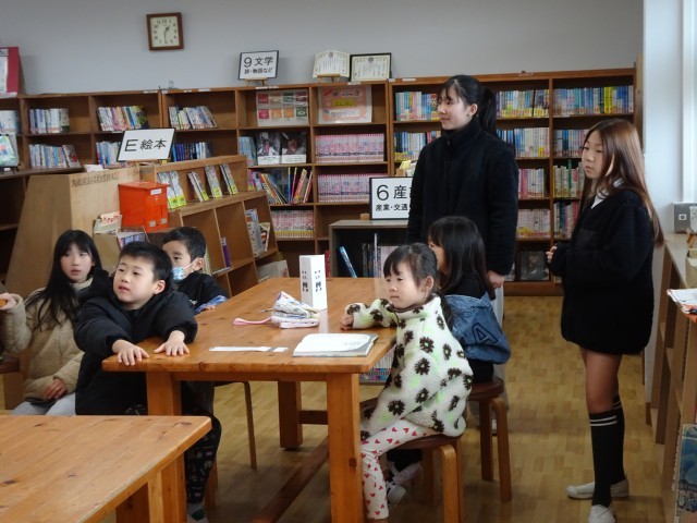 保護者の方が説明を聞いている間、新1年生は5年生のエスコートで校内を回り、1年生との交流を楽しんだり、図書室で本やDVDを見たりして過ごしました。