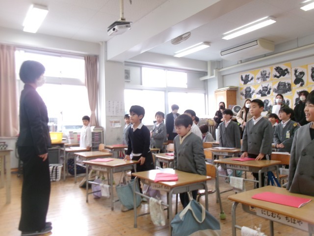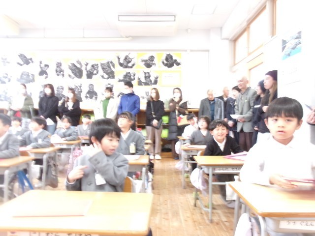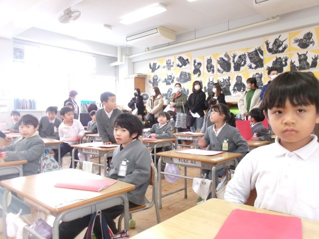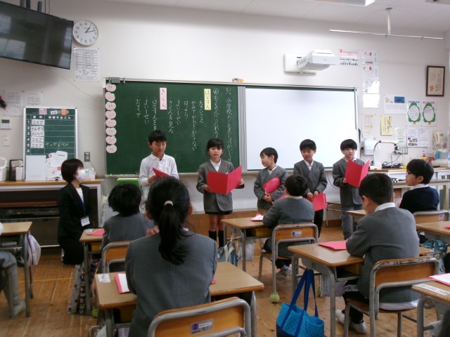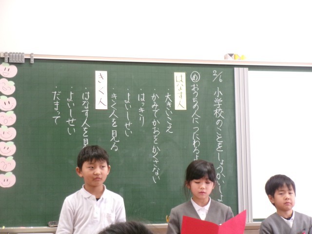 2月6日の参観日、1年生は国語「小学校のことをしょうかいしよう」の学習の発表を行いました。