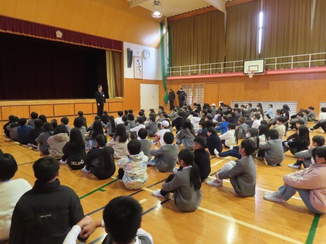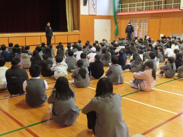 二宮駐在所と津山警察署生活安全課のおまわりさんに来校していただき、実際の経験談を交えながら、「自分の命は自分で守る」という強い気持ちをもつことの大切さについてお話をしていただきました。