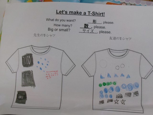 色やデザインを考えながら、「I like ~.」「This is my T-shirt.」などの表現を使って、自分の思いを英語で伝える練習をしました。