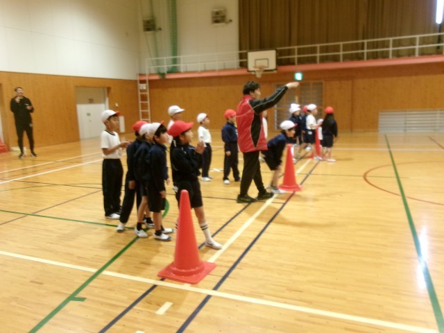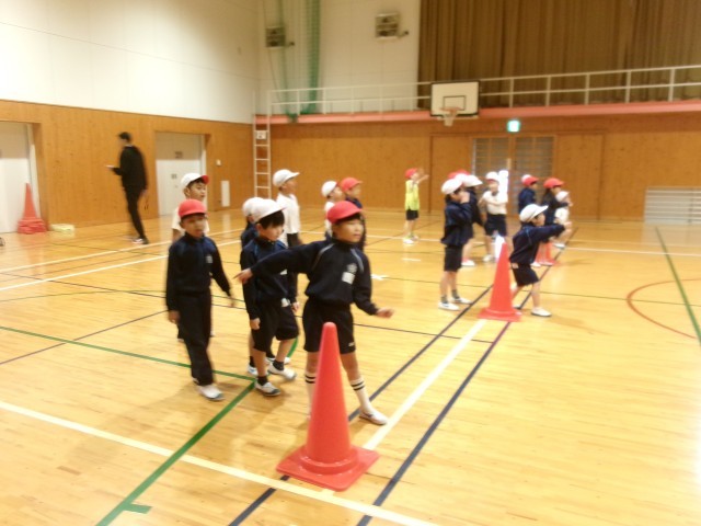 1年生は、いつものメニューに沿って、準備運動や動きづくりに元気いっぱい取り組みました。