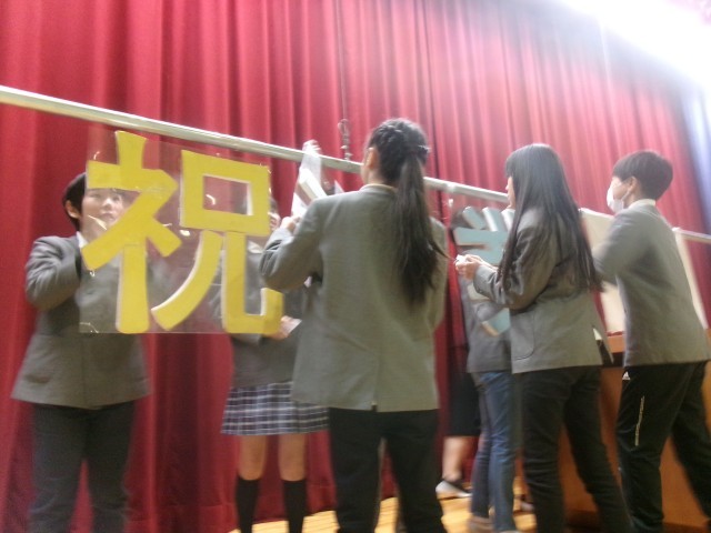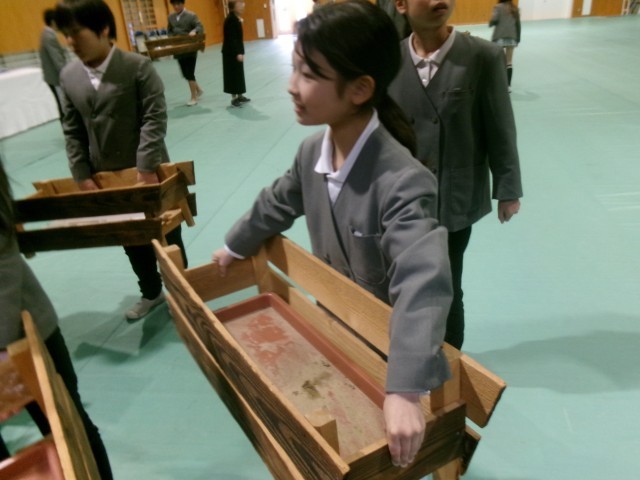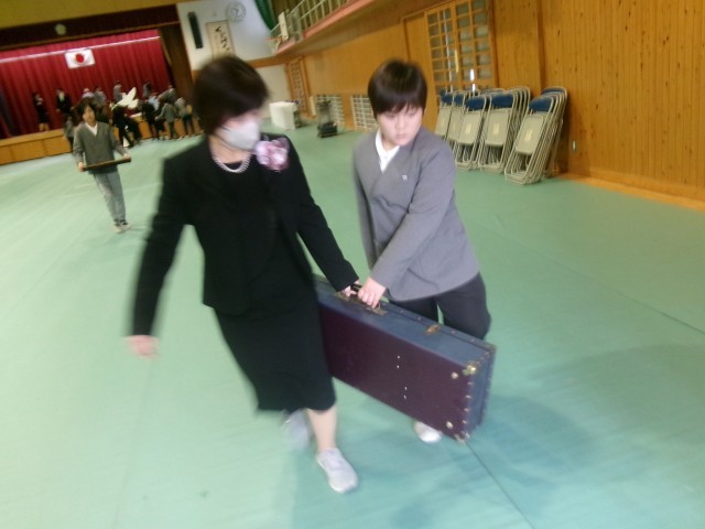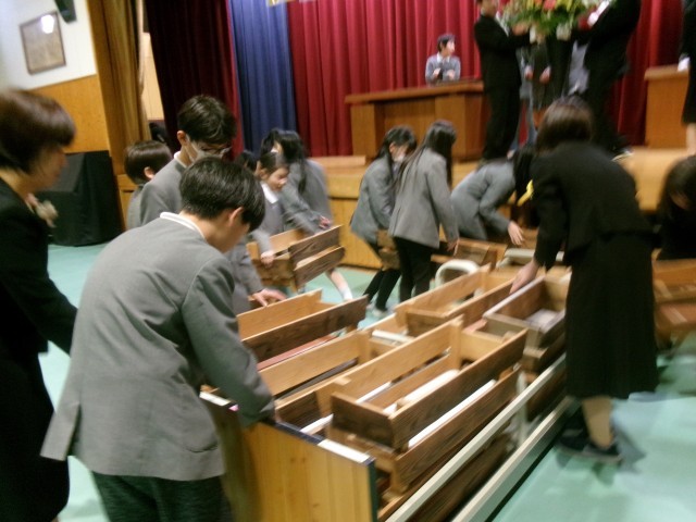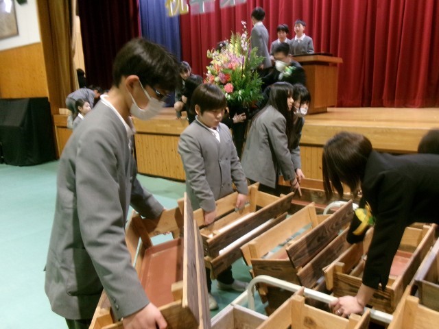 3月19日、卒業式終了直後、5年生が会場の片づけを行いました。