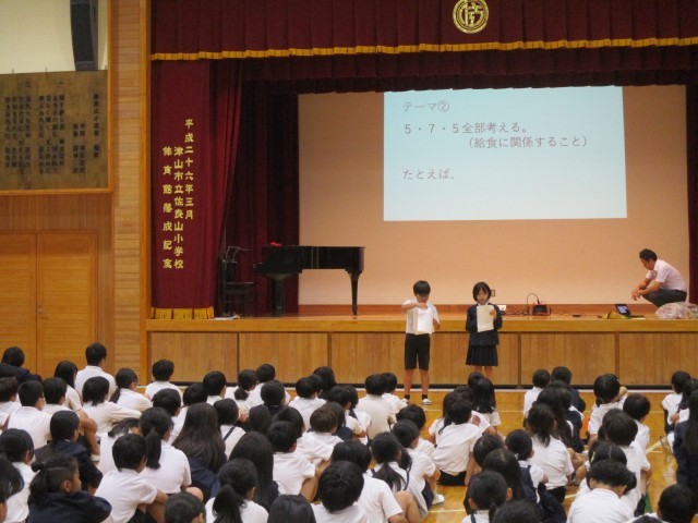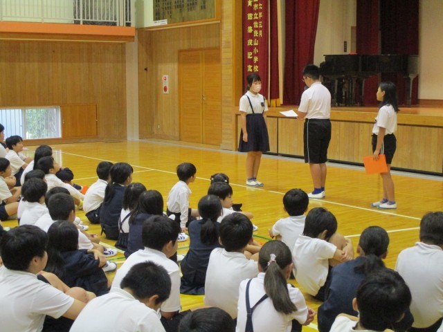 自主学習ナンバーワンの発表では、授業で学習した内容を自分で深めたりまとめたりした2人の紹介がありました。また、図書委員会からは、図書館での貸し出し冊数が1学期に30冊以上だった人の表彰がありました。すでに100冊以上借りている人が2人もいました。みんなで拍手をしました。最後には、健康委員会から「給食標語」の募集についてのお知らせがありました。