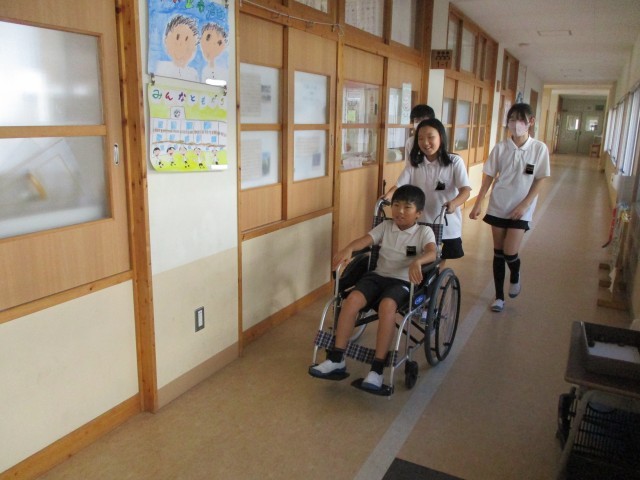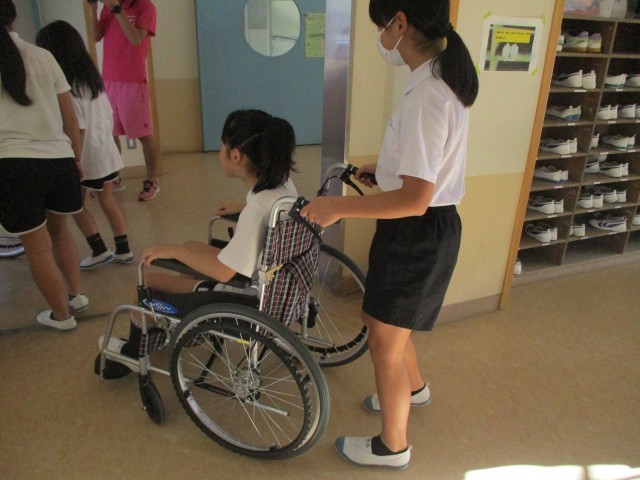 最初に車いすについての話を聞き、その後、グループで交代しながら、車いすの体験をしました。車いすを押すときには、乗っている人の立場になって、やさしく声をかけながら押すことができました。この体験を通して、子どもたちは、車いすの扱い方を学ぶだけでなく、足の不自由な人たちへの心遣いや配慮、自分ができる支援についても考えることができました。