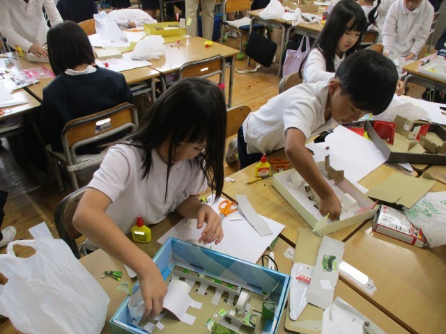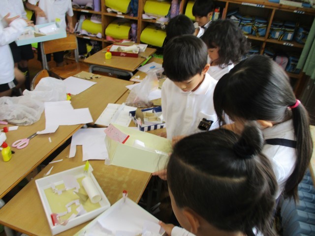 10月21日(火)に、1年生は校外学習で行った奈義運動公園で集めたどんぐりを使って、どんぐりめいろを作りました。家から持ってきた空き箱の中に、はさみやボンドを上手に使って、迷路を作っていました。途中で坂道があったり、トンネルがあったりとたのしい迷路を考えていました。