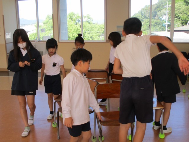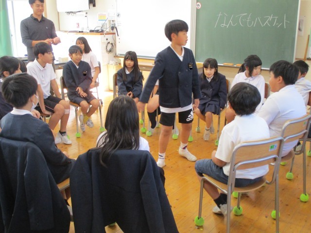 ドッジボールやいす取りゲームの定番遊びから、イラスト伝言ゲームや絵しりとりなど、1年生から6年生までが一緒に遊べるように工夫していました。秋晴れのさわやかな日に、笑顔いっぱいの姿が見られました。