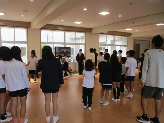 10月24日(金)の昼休みに、11月9日(日)のさら山時代祭の総踊りに向けて、佐良山地区の愛育委員の方が佐良山音頭と津山音頭の踊りを教えにきてくださいました。全校児童に呼びかけたところ、6年生を中心にたくさんの子どもたちが集まって、練習をしました。